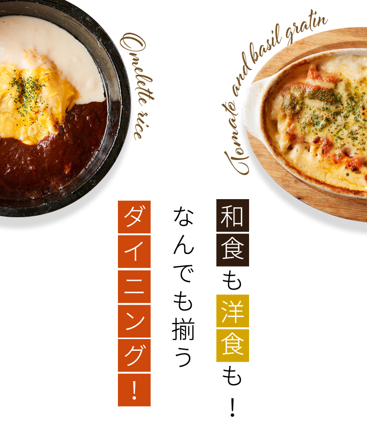 松戸市、松戸駅の夜ご飯、ディナーに何を食べようか迷ったら、和食やイタリアン、洋食も楽しめる当店へぜひ!名物の「石焼きオムライス」、パスタをはじめ、お酒のおつまみからボリュームのあるお料理まで多種多様に取り揃えています。